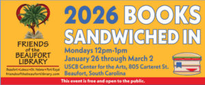 It’s time, once again, for everybody’s favorite Beaufort book series. Sponsored by Friends of the Beaufort Library, Books Sandwiched in will happy from Noon to 1pm on Mondays, January 26 through March 2, at USCB Center for the Arts auditorium, 805 Carteret Street, Beaufort.