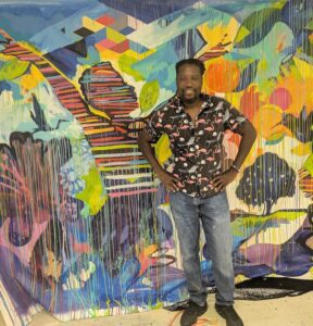 In the middle of the eye of this creative storm stands mild mannered Amiri, resplendent in a Pink Flamingo shirt and slightly paint splattered jeans. He speaks gently, taking care to choose his words, and my first impression is of being in the presence of a fully integrated human person, a la this guy really has his sh*t together. Two days later this will only be reinforced when I see him in action at the Port Royal Sound Foundation Maritime Center, giving a crisp and engaging gallery talk to adoring fans (dare I say groupies?). If you’re familiar with the psychological concept of flow, characterized by deep absorption, complete focus, and loss of self-consciousness, then you’ll understand the kind of vibe I’m describing. He’s all-the-way-Amiri and from that centeredness springs forth a contemporary multidisciplinary artist infusing rich meaning in whatever he touches, paints, collages, tapes, drips, and layers. Amiri offers this.