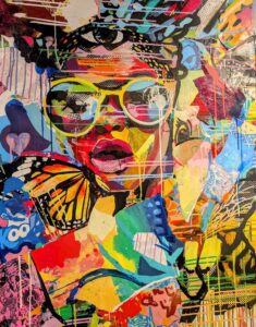 And just like that he collapses the past, present, and future in a 36 X 48” canvas that dazzles with its beauty and demands closer inspection. Note both the vertical and horizontal drips of paint, another way Amiri indicates the passing of time on the canvas itself. But for all the pleasing elements surrounding the girl’s face, including comic book art, patchy brush strokes, several eyes, and an observer taking in the girl’s arrival and labeling it “kool,” it’s still the face that commands the scene. Her mouth is slightly open, but this doesn’t seem to decrease her confident presence one bit. Like Amiri himself, the girl seems comfortable with who she is and who she might become, taking it all in and giving it back too.