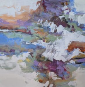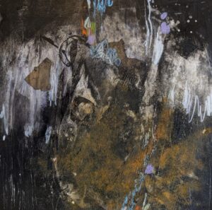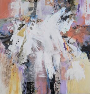 Creating mostly abstracts in mixed media, Penny finds this “opens more opportunities for chance chemistry.” She begins by gathering a selection of paint colors and papers, often inspired by her surroundings and nature. Her initial approach is spontaneous and intuitive, working with looseness and motion.