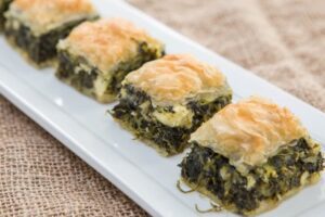 In a large bowl, combine spinach, cheeses, eggs, onion, dill, salt and pepper. Butter a 9×13-inch baking dish. Layer 8 to 10 sheets of phyllo dough in the dish. Brush each sheet liberally with butter while assembling. Spread spinach mixture evenly over phyllo dough. Top with remaining sheets of phyllo, brushing each one with butter. Brush top sheet with butter and pour any remaining butter over the spanakopita. Using a sharp knife, cut through spanakopita into 8 servings. Bake in a preheated 350 degree oven for 45 to 50 minutes or until top crust golden brown. Serves 8.