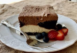 Preheat oven to 350 degrees. Lightly grease a deep 9×13-inch baking pan with cooking spray. In a large bowl, prepare cake mix according to package directions. Pour the cake batter into the prepared pan, using a spatula to spread evenly. In the same bowl, with an electric mixer, beat together ricotta cheese, sugar, eggs, and vanilla extract until smooth. Gently spread ricotta mixture evenly over the cake batter. Bake for 60 minutes or until center of cake is set. (The ricotta layer will sink into the cake batter while baking. You will end up with a very thin layer of cake on the bottom, a cheesecake layer, and a thicker cake layer on top.) Let the cake cool completely on a baking rack. In a large bowl, whisk the pudding mix with the milk until smooth. Gently fold in the whipped topping until well combined. Spread the pudding mixture over the cooled cake. Cover the cake and refrigerate, for at least 8 hours, before serving. Best served cold. Serves 12 to 15.