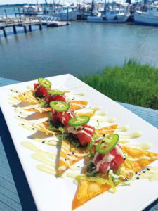 with some nice additions, and that’s just fine with us. There are several ‘sandwich’ options, including a Surf ‘n Turf Burger featuring grilled shrimp and house-made pimento cheese atop a hamburger, the Daufuskie Crab Cake Sandwich, a Camp Burger, with fried green tomato and pimento cheese, a tasty Local Shrimp Burger, an Oyster Po’ Boy, fish tacos, and a catch of the day fish sandwich, served blackened, grilled, or fried. For lunch entrées, we love the addition of the Tuna Salad Niçoise, featuring their tuna au poivre, as well as an Ahi Tuna Poke Bowl. Can you tell we like Fishcamp’s treatment of tuna?