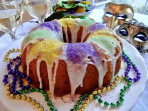 King Cake is a ring of cinnamon cake topped with sweet icing and purple, green and gold-colored sugars.