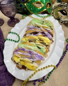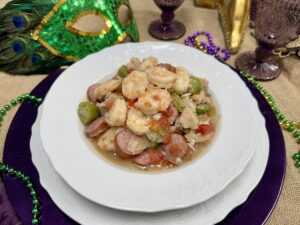 Growing up in eastern North Carolina, I don’t remember ever celebrating Mardi Gras. There were no king cakes or green, purple, and gold beads. There were no Fat Tuesday parades or parties. I don’t think we had Shrove Tuesday pancake dinners either, at least not at First Baptist Church of Wilson. The idea of hosting a gluttonous throwdown with beaucoup alcohol on the day before Ash Wednesday wouldn’t have gone over very well with the “parental units” of my youth. But when I moved to Beaufort, Mardi Gras events began popping up every few years or so. They were always lots of fun with masks and music — and even an impromptu parade down Bay Street with a brass band in the very late evening one year, much to the chagrin of our local law enforcement. Mardi Gras is billed as one last night of feasting and revelry before the beginning of Lent, the time of year when Christians begin preparing for Easter. As much as I love a good party, my true fascination with Mardi Gras isn’t about the merry making. It’s about the food. Mardi Gras cuisine is a rich fusion of French, Spanish, African, and Native American influences — collectively known as Cajun and Creole. Fare typically includes savory stews, fried pastries, and seafood, with iconic dishes like gumbo, jambalaya, and king cake defining the celebration. The real deal with the rich, fatty, and indulgent Fat Tuesday foods is that folks were trying to use up meat, dairy, and eggs in their larders in order not to waste them before a restricted Lenten diet began. People were just trying to use up ingredients. I find that fascinating. It’s also good stewardship. A pot of gumbo will feed a bunch of folks. That’s where this week’s recipes come to play. I’ve taken three traditional Mardi Gras recipes and given them a makeover. Muffaletta Dip, with ingredients from the muffaletta sandwich, is a warm and hearty appetizer, best served with sturdy crackers or toast. Mardi Gras Gumbo features chicken, sausage, and shrimp but can easily be adapted to use whatever meats you have on hand. And, my King Cake Praline Danish is a delicious twist on traditional king cake with a flaky pastry crust and a cream cheese and pecan filling. A reader asked me last week, “what do you do with the food that you cook for your column?” I certainly can’t eat it all by myself, so I usually share with my neighbors and friends. Last night, I invited two dear friends over for a pre-Mardi Gras supper. I’m pleased to report that all three recipes were hits – and the kittens didn’t jump on the table. Yes, kittens. That’s another story for another time. Laissez les bons temps rouler. Let the good times roll, y’all!