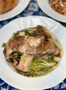 Place ribs in crockpot. Mix dressing mix with soup and pour over ribs. Cover and cook on high for 3½ hours. Cut bok choy: separate leaves from white stalks, slice stalks lengthwise, then crosswise into ¼-inch pieces, and the leaves into ½-inch strips, keeping the stems separate from the leaves to add them at different cooking times for perfect texture. Add bok choy pieces to crockpot. Cover and continue to cook for 45 minutes. Add green leaves to crockpot, cover and cook for 15 minutes more. Serves 2.