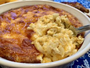 Preheat oven to 350 degrees. Roughly cut the cooked spaghetti into 3-inch pieces and toss with half the butter. Lightly whisk the eggs with the milk in a large bowl. Add the mustard, salt, peppers, and half the cheese. Put half the spaghetti into a greased 3-quart baking dish, sprinkle with cheese to cover and 1 tablespoon of the butter. Ladle on half the egg/cheese mixture, top with the rest of the spaghetti. Ladle on the remainder of the mixture and enough cheese and the remaining butter to cover the top. If the dish is deep, it may not need all of the cheese. Move to the preheated oven. If the dish is less than three inches deep, bake for 30 minutes; if deeper, bake for about 45 minutes. Check and reduce the heat 25 degrees if the cheese is browning too much or the custard is bubbling. Cover lightly with foil and continue to bake until a fork inserted in the custard comes out clean and the top is golden brown, up to 40 minutes more, depending on the thickness of the baking dish. Serves 6 to 8.