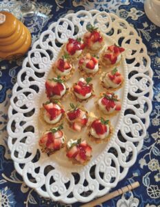 Allow both cheeses to reach room temperature. Crumble Roquefort cheese in a mixing bowl. Add cream cheese and whipping cream. Use a hand mixer to combine until creamy. Place cheese mixture in a piping bag or small plastic bag and pipe filling into phyllo shells. Top with chopped strawberries and garnish with a sprig of mint or fresh chopped basil. Drizzle with honey before serving. Makes 30 appetizers.