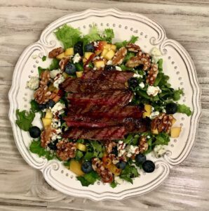 I always gain weight in the summer. I guess it’s because my event schedule is not as busy, and likely because I’m spending more time on the couch with my sweet kitty Belle, binge watching movies on Netflix. Yep. The couch is most certainly the culprit. I recently decided to get back on track and get rid of those pesky pounds before things totally got out of hand. I love salads, but I’m also a carnivore. I can easily forgo desserts if I can fill up on protein. My challenge was to come up with a selection of healthy and filling salads that included enough protein to be as satisfying as a complete meal. As it turns out, it was easy. This week’s photos are for salads that are beyond delicious and are also simple to throw together. The recipes this week are mostly for the vinaigrettes, condiments, and toppings. You can increase or decrease the salad ingredients to serve one or to serve twenty. We’re blessed with the best of the best summer fruits and vegetables in the Lowcountry. Take the time to slice, dice and chop. It’s worth it. I promise.