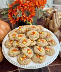 Preheat oven to 350 degrees. In a large mixing bowl, cream together butter, brown sugar and sugar until light and fluffy. Add the eggs and vanilla extract. Mix well. In a separate bowl, whisk together the flour, baking soda and salt. Gradually add the dry ingredients to the wet ingredients, mixing on low speed until just combined. Fold in chow mein noodles. Using a cookie scoop, drop rounded balls of dough onto parchment lined baking sheets. Bake each batch for 10 minutes. Remove cookies from oven and top with several candy corns. Return to oven and bake for 2 more minutes or until edges are slightly golden. Let cool on baking sheet for 5 minutes before transferring to wire racks. Makes about 60.
