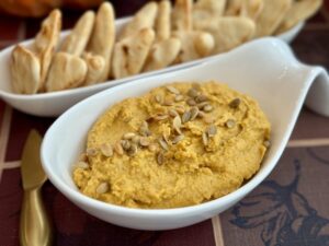 Place all ingredients in a food processor and process until smooth and creamy. Add a dash of water if the hummus is too thick and adjust seasonings to your preference. Serve hummus in a bowl garnished with pumpkin seeds and a drizzle of extra-virgin olive oil. Serves 6.