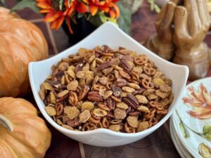 Preheat oven to 300 degrees. In a large bowl, mix cereal, pretzels and pecans. In a separate bowl, mix melted butter with brown sugar and pumpkin pie spice. Pour butter mixture over cereal mixture, toss gently to coat. Spread mixture evenly on a large rimmed baking sheet. Bake for 50-60 minutes, stirring every 10 minutes, until snack mix is toasted and dry. Store in an air-tight container. Makes 10 cups.