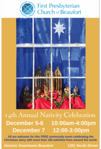 For the 14th year, historic First Presbyterian Church of Beaufort will present a free weekend-long Annual Nativity Celebration on December 5-7 – featuring more than 200 nativity scenes from around the world.