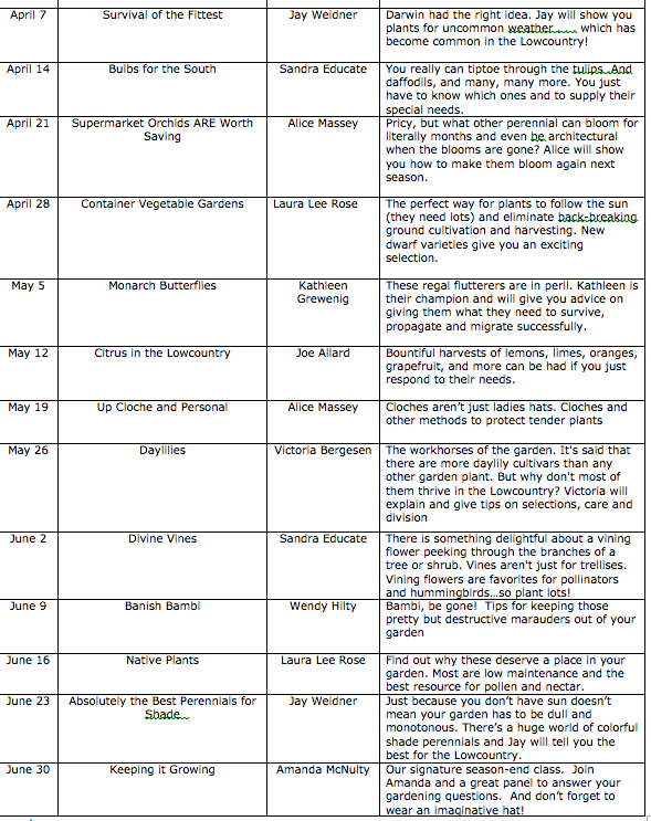 owcountry Master Gardeners’ 9th year to present their award winning series of classes, lectures and workshops, ‘Lunch and Learn.’ This free springtime series showcases local professionals and Master Gardeners giving valuable information and tips on gardening in our unique climate. The Gazebo at the Port Royal Farmers’ Market at noon is the place to be beginning April 7th,