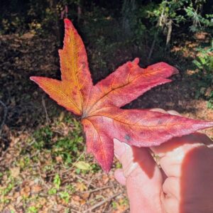 Of course this becomes most pertinent every autumn. Growing up in the north I was able to spend hours and hours in the colorful woods every fall and have felt the power in the annual shedding of the oaks, maples, birches, sweetgum trees, and more. I’ve stood in the midst of swirling winds with leaves cascading down like water from a mighty stream. The idea of catching them as a fun pursuit is one that I’m sure many kids and kid-like adults have had. Possibly they’ve also experienced the realization that it can be tougher than it looks as those bits or colorful delights twist and turn to the ground. But I’ve never heard of someone saying catching one in the air produces good luck.